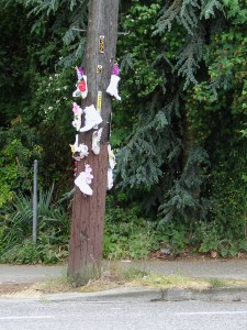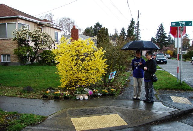 Memorial shoes at the corner of 33rd Ave NE where the Schulte family stepped into NE 75th Street. Photo by Valarie.