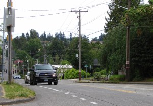 NE 75th Street looking eastward towards Safeway at the intersection of 35th Ave NE. NE 75th Street has been “channelized” with a center turn lane and bike lanes for safety. Photo by Valarie.