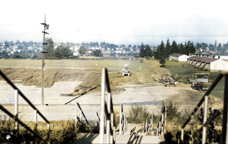 In this photo of 1950, the photographer is standing on the steps leading up to the View Ridge School. We are looking west out over the grading machines working on leveling View Ridge Playfield. Seattle Municpal Archives photo #30437.