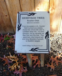 The City of Seattle’s Department of Urban Forestry officially recognized the NE 77th Street scarlet oak as a Heritage Tree in 2008, in a ceremony installing a plaque beneath the tree. This is because the tree is actually “in the street” so it has come under the care of Urban Forestry.