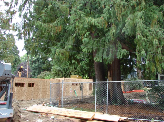 After extensive protests by neighbors and concerned community groups, the developer agreed to leave this particularly large and outstanding Western Red Cedar in place at the edge of the lot. The number of structures to be built, had to be reduced in order to preserve the tree.