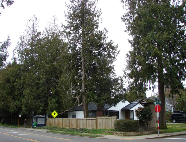 Lawson Cypress (overgrown) partially concealing the gatepost of Wedgwood at NE 81st Street. On the east side of the street are the townhouses which replaced Balch’s original complex of offices. Photo by Valarie, October 2023.