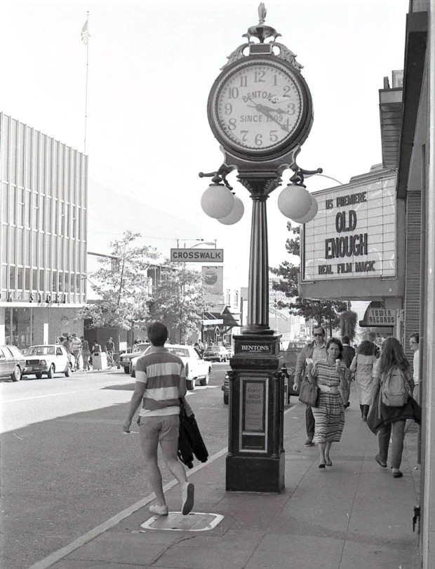 Over the years the Benton’s Jewelers street clock moved with the store to its two locations in the University District, 4319 and 4343 University Way NE. The clock had been bought new for $700 in 1915. In 1976 it was struck by a car and taken for repairs which cost $7000.