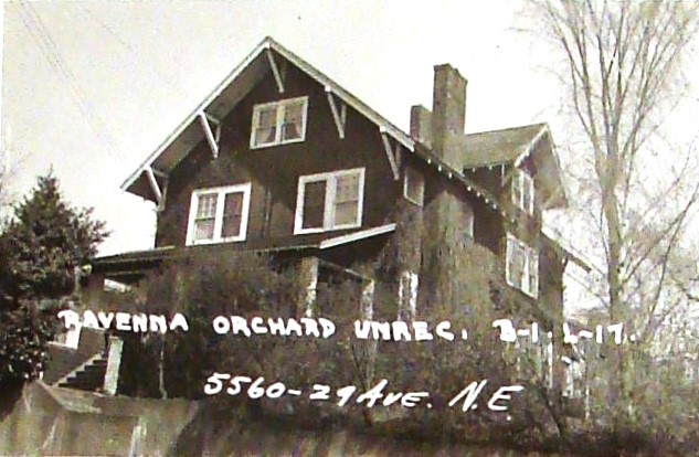As of 1906, when Hugh Benton began selling lots along 28th and 29th Avenues NE, it was noted in the real estate advertisements that the lots had apple trees, and so the site was named Ravenna Orchard. We know that apple trees take at least seven years to grow until the first crop of fruit, which shows that a landowner earlier than the Bentons had probably planted the trees. The first houses on these streets were built in 1908, including one for the Hugh & Mary Benton family.