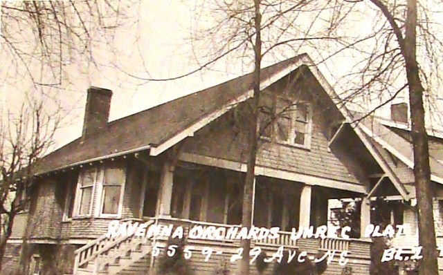 In 1908 the Hugh Benton family was first listed in their new house at 5558 29th Ave NE in the Ravenna Orchard Addition. By that time a streetcar line had been extended eastward across NE 55th Street with its end point at the corner of 35th Ave NE. This was very convenient for residents of Ravenna Orchard to get on the streetcar for shopping trips or for commuting to work.