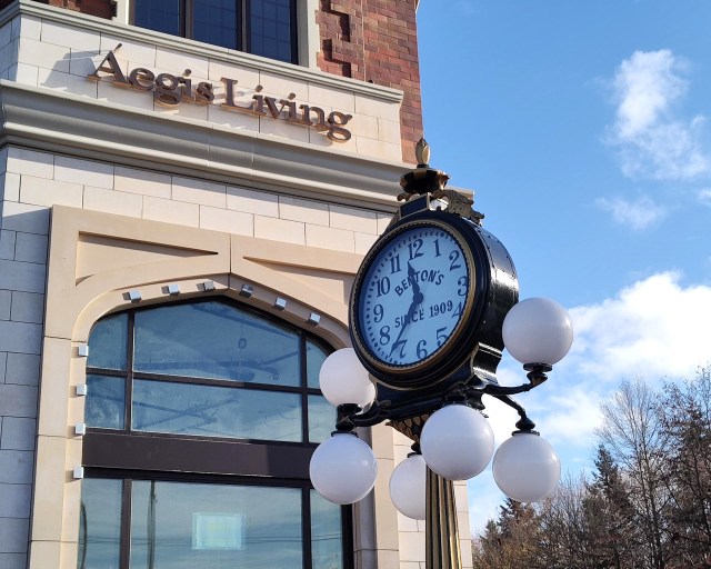 Benton’s Jewelers street clock in a new placement at Union Bay Place NE, December 2023. Photo by Valarie.