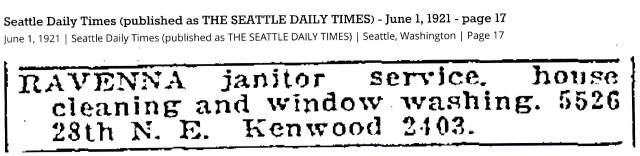 After 1921 when most of the shipyards had closed, Adam’s occupational listing in the Seattle City Directory again returned to “janitor.” He may, however, have been working for himself instead of at a company, as indicated by his classified ad in the newspaper for “Ravenna Janitor Service.” Perhaps Charles & Nora Adams worked together in cleaning services. There is at least one listing in the Seattle City Directory that Nora was a cook. Perhaps she worked for a family in the neighborhood.