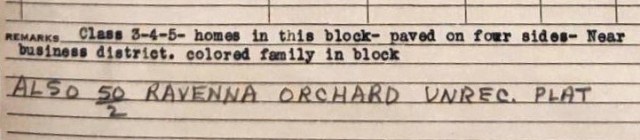 For 28th Avenue NE in the Ravenna Orchard neighborhood, we don’t know if someone told the surveyor that a black family lived in the 5500 block, or if the surveyor observed this for themselves. They recorded the Adams house, and two houses on either side, with the notation that “a colored family lives in the block.” This notation was meant to indicate that the presence of a “colored family” could affect the property value of nearby houses.