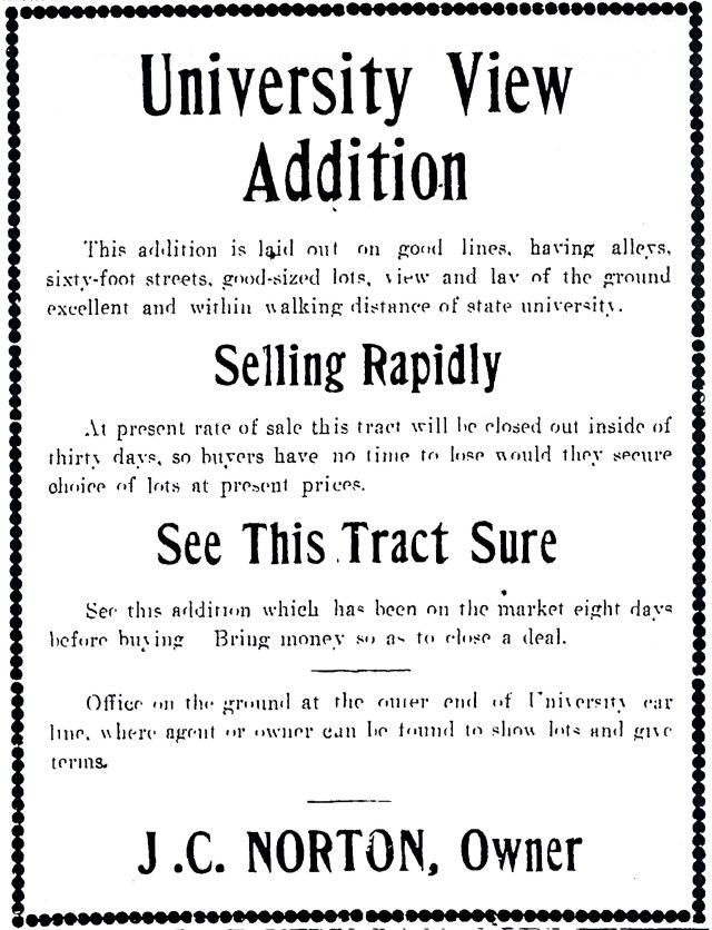 The Nortons named their plat the University View Addition, showing that in 1906 they were aware of the increased real estate activity near the University of Washington, due to preparations for the AYP Exposition on the campus. Naming their plat “University View” implied a convenient location not far from the UW. A nearby plat of 1907 filed by the Crawford & Conover real estate agency was named Exposition Heights for the same reason.