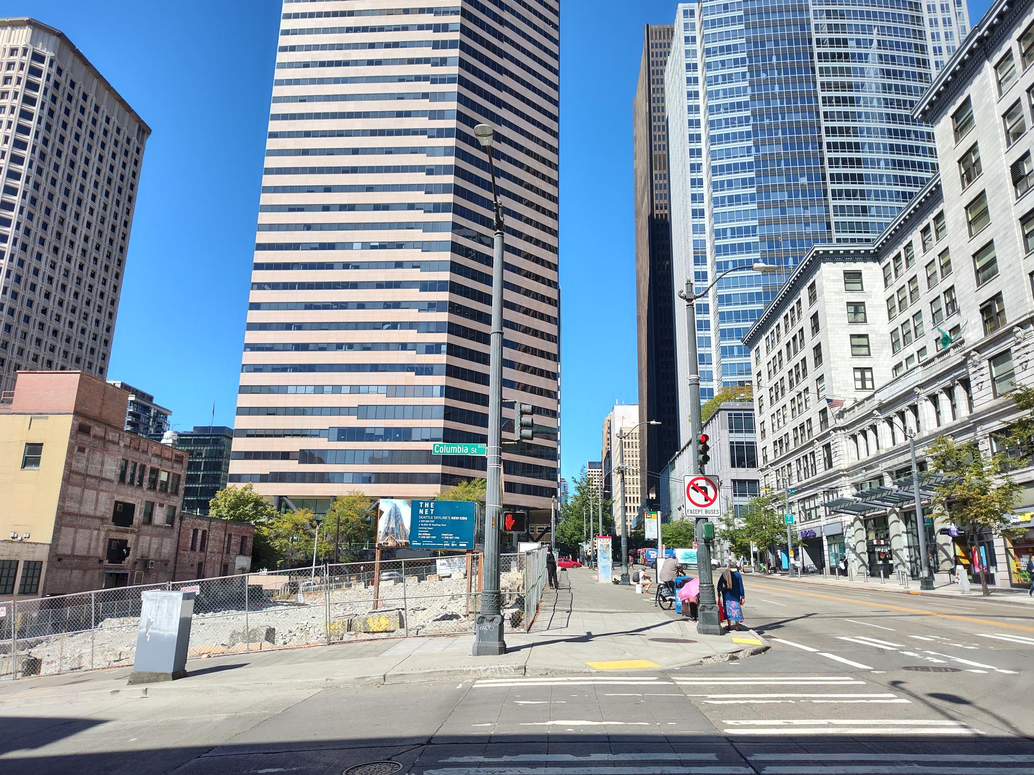 The northwest corner of Third Avenue & Columbia Street in downtown Seattle was once the site of Cordelia’s boarding house. In the backgounnd is the Wells Fargo Bank.
