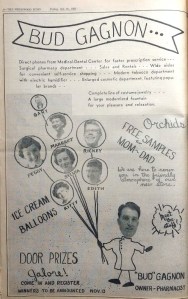 Bud Gagnon’s WedgEwood Pharmacy started in 1952 at the northwest corner of NE 85th Street, adjacent to the McVicar Hardware store. In 1955 Bud Gagnon built a new pharmacy building at the north end of the same block, at the corner of NE 86th Street. The pharmacy closed and was torn down in 1971 for construction of the present bank building (now Wells Fargo).