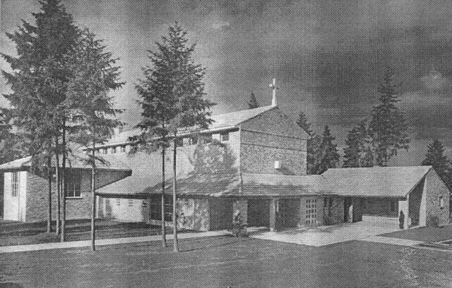 The first Our Lady of the Lake, completed in 1941 at 8900 35th Ave NE, was this small brick structure designed by architect Paul Thiry. Image courtesy of the Seattle Historical Photographs Collection, #18245, Seattle Room, Central (downtown) Seattle Public Library.
