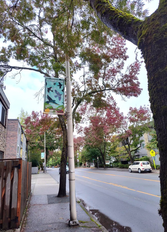 The Wedgwood business district is made beautiful by street trees.