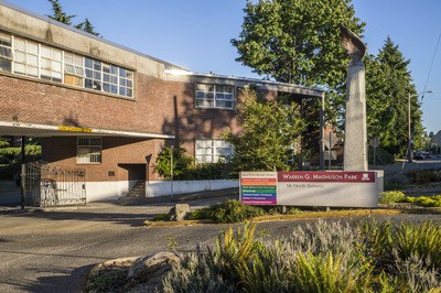 The entrance gate at 7400 Sand Point Way NE to the former Naval Air Station, now Magnuson Park.