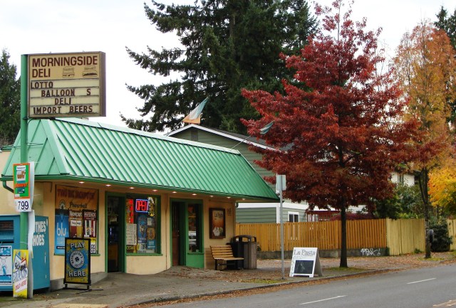The Morningside Market in Wedgwood, 9118 35th Ave NE, which opened in 1926, has a friendly bench. Photo by Valarie.