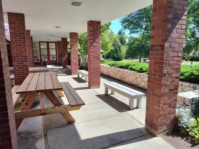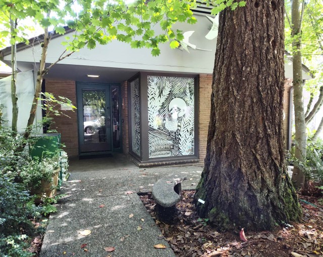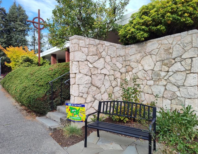 The courtyard entry of Wedgwood Presbyterian Church provides a place to sit and watch the world go by. Photo by Valarie.