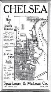 In 1916 the Yates became real estate developers by filing a plat of land on the north side of NE 110th Street and advertising the area as “Chelsea.” House lots were available, and a Chelsea store was built on the corner of NE 110th Street & 35th Ave NE.