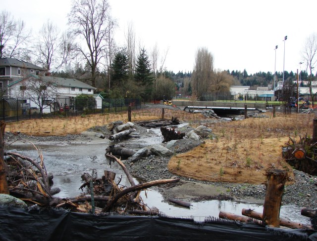 The south branch of Thornton Creek runs parallel to the Nathan Hale High School building. Bridges link the student parking lot to the building.