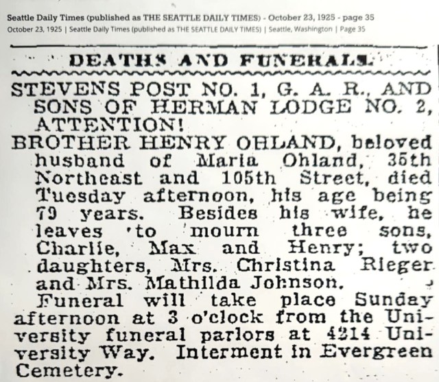 Death notice of Henry Ohland Sr., funeral info for members of the Grand Army of the Republic. October 23, 1925, Seattle Daily Times, page 35.