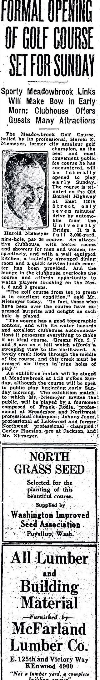 “Formal Opening of Golf Course Set for Sunday,” July 24, 1931, Seattle Daily Times, page 15. Column includes advertisement for McFarland Lumber which supplied all lumber & building materials for the Meadowbrook Golf Course and its clubhouse.