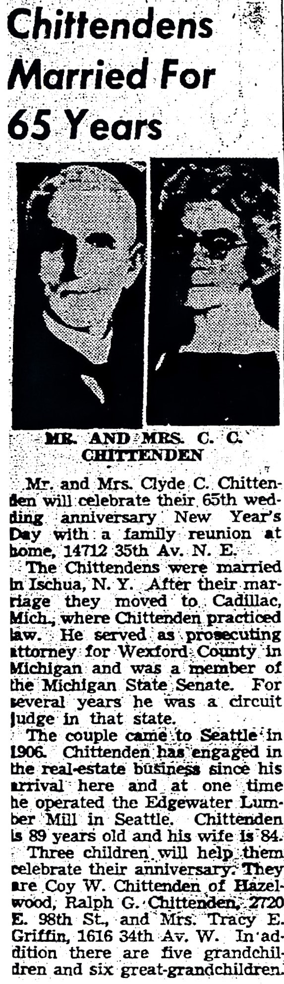 Chittenden wedding anniversary noted in the Seattle Daily Times, December 26, 1949, page 17.