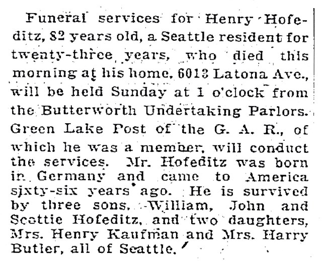 Henry Hofeditz lived to be 82 years old, and when he died in 1923 the Green Lake Post of the GAR conducted the memorial service. Daughter Anna lived in the house at 6013 Latona Avenue for the rest of her life; she died in 1984 just three days before her 101st birthday.