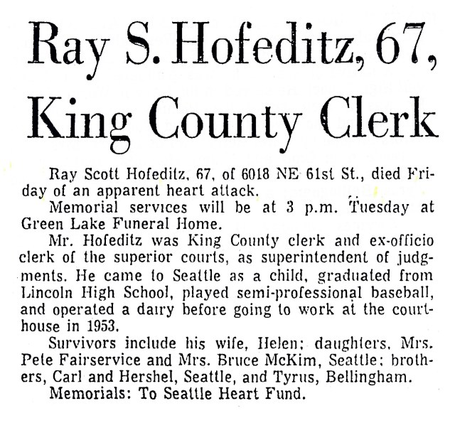 At age 50 in 1953, Ray Hofeditz made a sudden change of occupation due to these social and economic changes which had caused the demise of small dairy plants. Ray went to work as a clerk at the King County Courthouse in downtown Seattle.