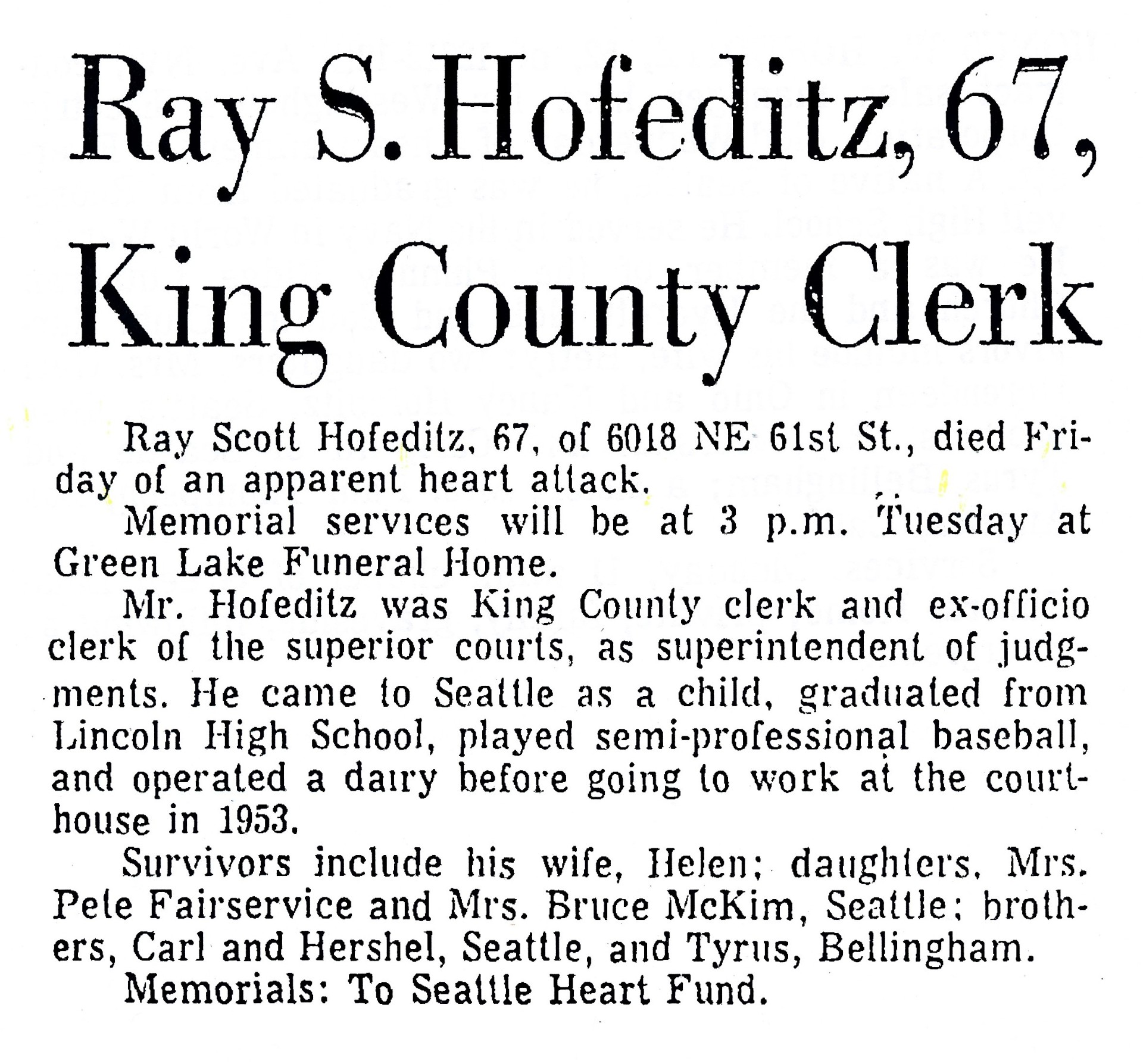 Ray Hofeditz obit.3 November 1969 Seattle PI page 39