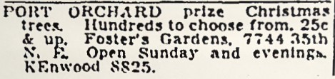 Foster’s Gardens 1943 advertisement for Christmas trees, in the Seattle Post-Intelligencer newspaper, December 16, page 22.