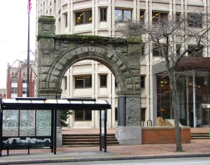 Stone arch which is a remnant of the Burke Building, torn down to build the present Federal Building at Second & Marion Streets in downtown Seattle. Photo by Valarie.