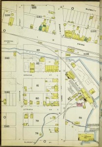 As shown on a fire insurance map of 1893, the Fremont neighborhood was centered around its bridge over a small stream, with a lumber mill on one side.