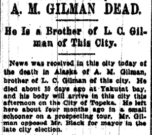 A.M. Gilman became a ship captain based in Seattle. He married in 1883 and became involved in city politics. At age 56 his thirst for adventure awoke again, and he traveled to Alaska during the gold rush. When he died in Alaska in 1896 his death notice in the Seattle newspaper did not mention his brother Daniel Gilman, who was no longer living in Seattle at that time. Mentioned in the death notice of A.M. Gilman was another brother, L.C. Gilman.
