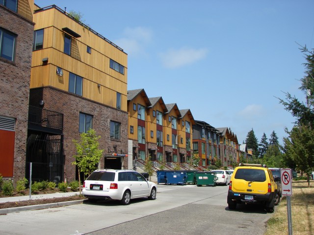 Corner of NE 68th Street and 34th Ave NE, looking eastward past the MOD apartments towards the library and 35th Ave NE. Photo by Valarie, December 2025.
