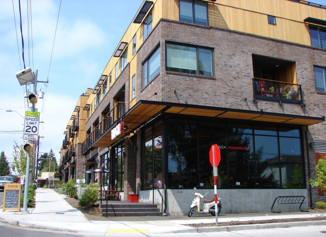 NE 68th Street corner of 35th Ave NE, with the MOD Apartments (former Theodora Home) at left and the Northeast Branch Library on the right. Photo by Valarie, January 2026.