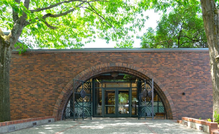 Lake City Library front sidewalk with autumn foliage.October 2024
