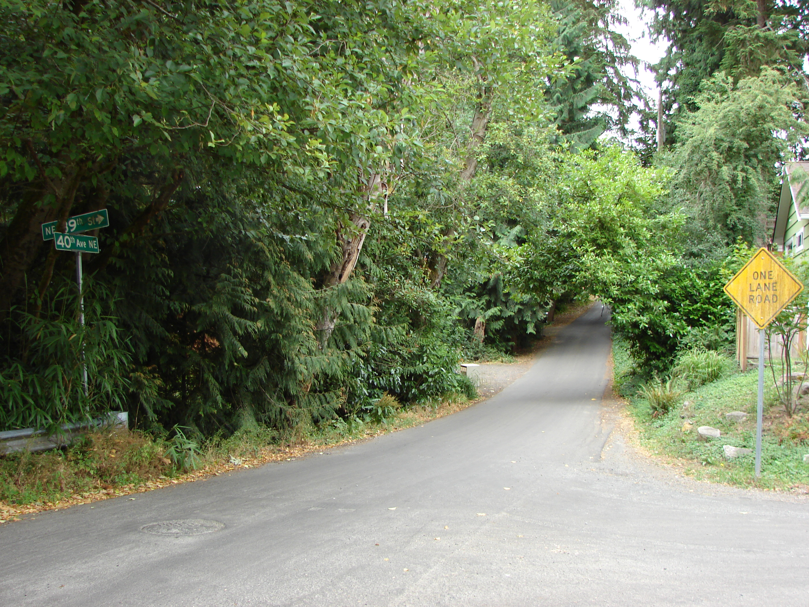 Looking southward along 40th Ave NE from the former site of Laurette Stanley’s house at NE 89th Street, today there is still a reminder of its remote location at the edge of the Maple Creek Ravine.
