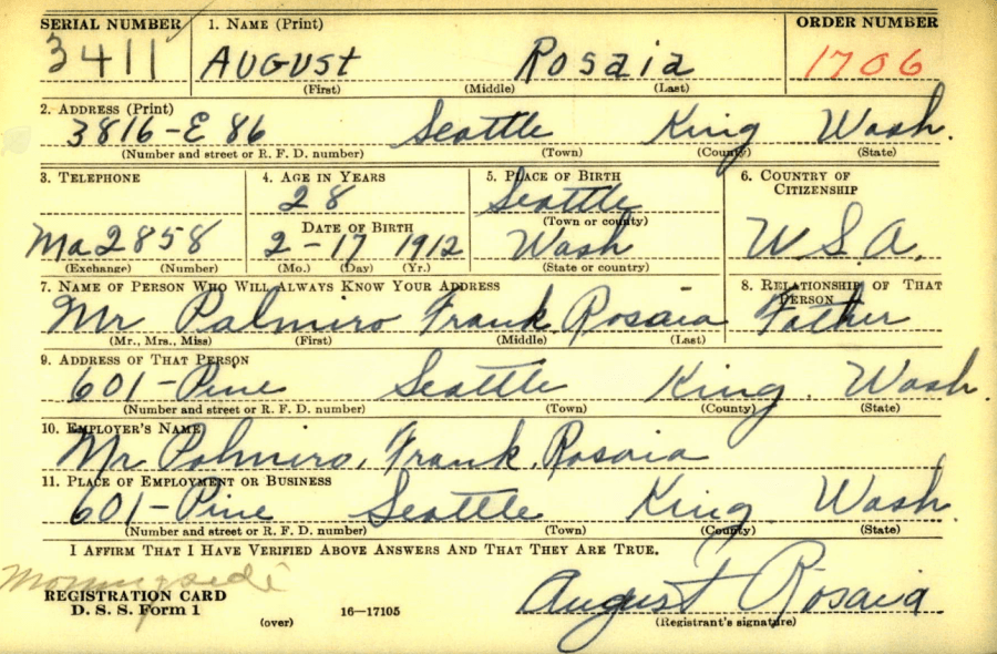 1940 draft card for Gus Rosaia, age 26. He was the third of Palmiro Rosaia’s five sons.