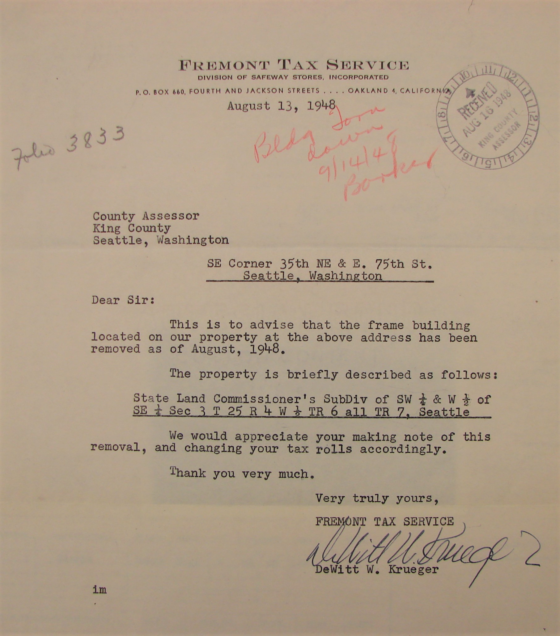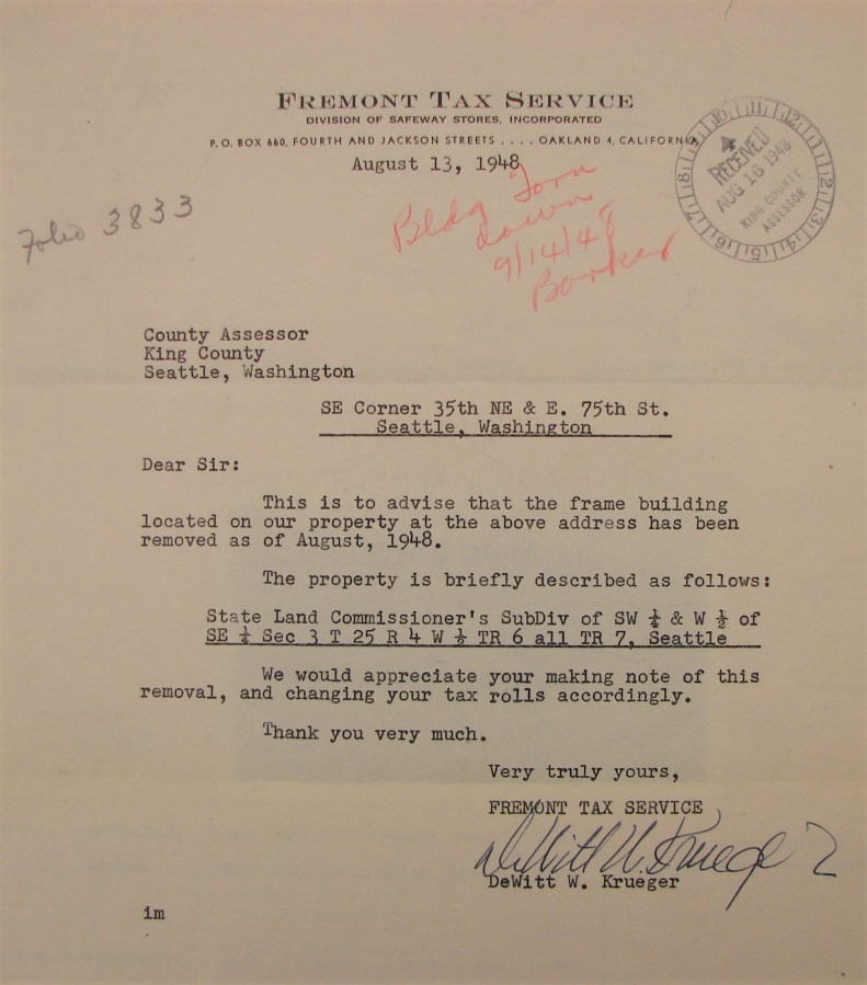 Safeway letter for old barn torn down in 1948